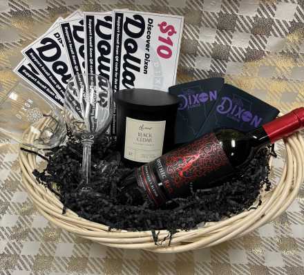 Treat yourself or someone special to a perfect date night or local adventure with this thoughtfully curated basket. Enjoy a bottle of fine wine and explore the best of the area with $50 in Discover Dixon Bucks redeemable at local shops and restaurants.