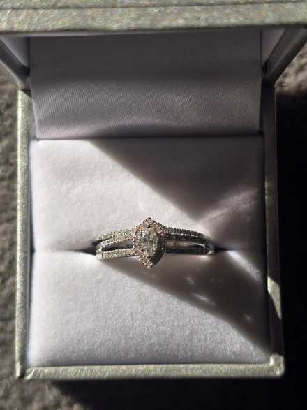 Celebrate elegance and love with this 14K white gold diamond wedding set, featuring a beautifully designed marquise-shaped center cluster surrounded by shimmering round diamonds. The split-band design adds a modern touch, with additional accent diamonds lining each side for extra brilliance. With approximately 0.40 total carat weight, this two-piece set offers just the right balance of sparkle and sophistication. Delicate yet eye-catching, it’s the perfect set to mark a special moment—or upgrade your everyday shine. Don’t miss this stunning piece at auction pricing!