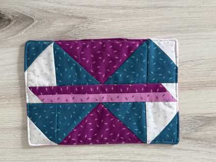 A bold and modern mug rug featuring a mini "Detour" - inspired block in striking Libs Eliott fabrics. Vibrant teal, magenta and lilac prints combine with crisp piecing for a graphic pop of color on your desk, sewing table, or coffee nook. Fully finished, quilted, and ready to use or gift.