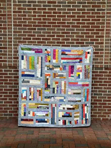 A lively scrappy quilt fill of color and character.  This quilt features bright, unpredictable pathways of pieced strips, framed by soft gray sashing that gives structure to the playful layout.  Every block feels like a turn onto a new route!  Professionally quilted with a smooth overall pattern that enhances texture and movement.