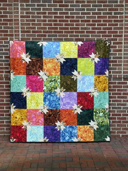 "Fitz and Stars" is a vibrant, color-rich quilt featuring bold 12" blocks from the Nebula Collection paired with crisp white star points scattered throughout. The swirling, marbled textures of the fabrics create movement and depth, while the star accents add contrast and sparkle. Professionally quilted with a curvy modern motif that enhances the flow of the fabrics.