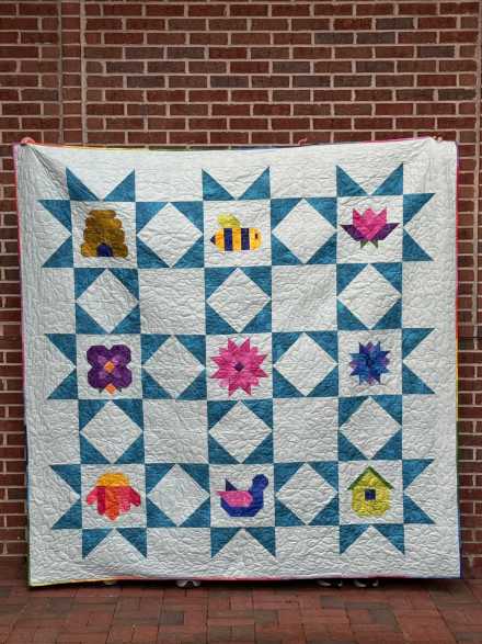 This cheerful sampler quilt was created for the 2025 Northside Shop Hop, featuring a collection of adorable themed blocks - beehive, bee, flowers, birdhouse, duck, and more - set within bold aqua star frames. Bright, clean Glaze fabrics by Libs Elliott give each block fresh modern color with her signature textured printed effect. Professionally long-armed adds movement and brings the sampler to life.