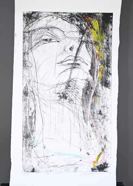 An expressive print by Ukrainian artist Eduard Belsky, created with a mixed printmaking process—drypoint, etching, and monoprint—layered to produce rich textures, incisive line, and dynamic contrasts. A unique impression.