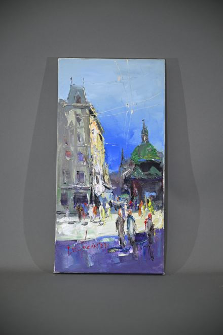 A painting by Ukrainian artist Ihor Yevsin, portraying the historic center of Lviv—its old architecture rendered in a vivid, colorful manner. Executed in acrylic on canvas, the work is original and signed by the artist.