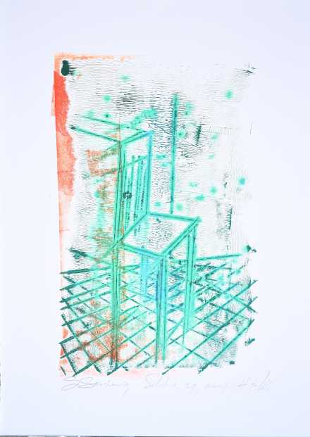 A graphic work by Ukrainian artist Serhiy Savchenko depicting a room with a solitary chair and strong perspective lines—a distilled metaphor and the artist’s gaze on existential questions of life: time, existence, being, and the human path and fate.