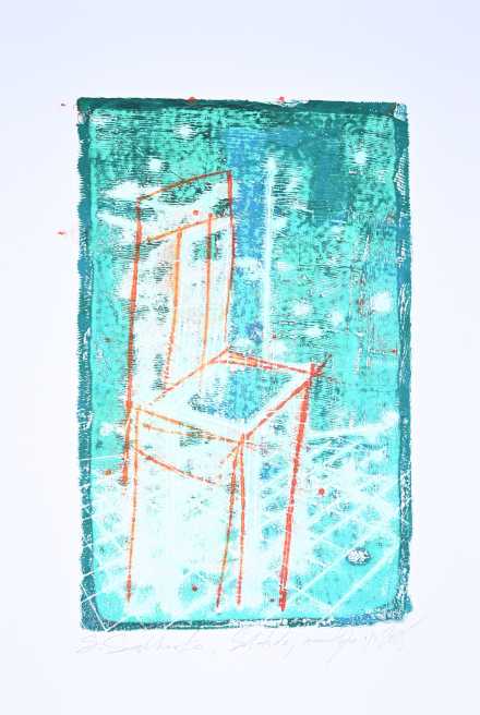 A graphic work by Ukrainian artist Serhiy Savchenko depicting a room with a solitary chair and strong perspective lines—a distilled metaphor and the artist’s gaze on existential questions of life: time, existence, being, and the human path and fate.