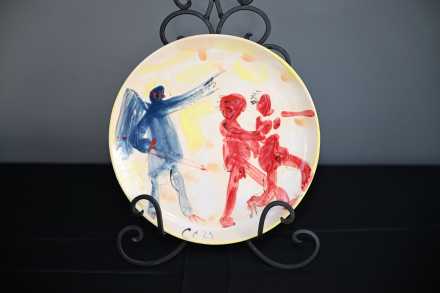 A unique, hand-painted ceramic plate by Ukrainian artist Serhiy Savchenko, created and kiln-fired in Lviv in 2025. The imagery alludes to the biblical “Expulsion from Paradise”: Edenic motifs and dynamic figures rendered with expressive brushwork and luminous glazes, bridging icon-like clarity with contemporary abstraction.