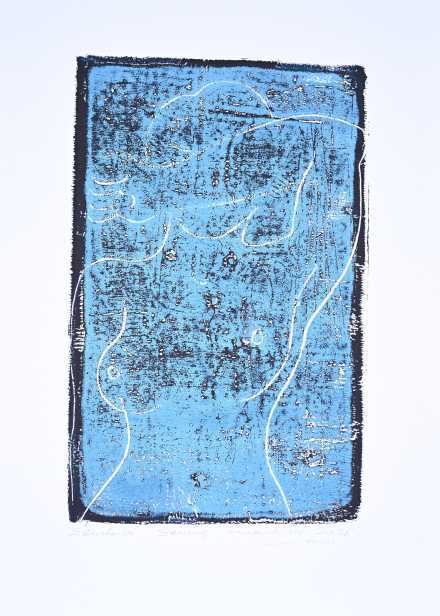 A graphic work by Ukrainian artist Serhiy Savchenko depicting a woman who covers her eyes, as if shielding them from a burst of bright light. The image captures a moment of vulnerability and radiance—where illumination becomes almost overwhelming.