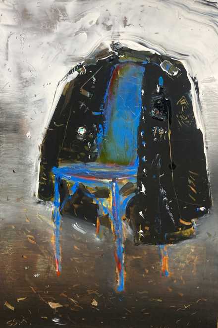 A painting by Ukrainian artist Serhiy Savchenko depicting a solitary chair with a coat—or perhaps a uniform—draped over its back. The image becomes a symbol of homecoming after a long journey, hard labor, or war. The motif of return runs throughout Savchenko’s practice: through this chair, he gives form to hopes for friends now at the front—a quiet, prayer-like refrain for everything, and everyone, to come back to their rightful place.