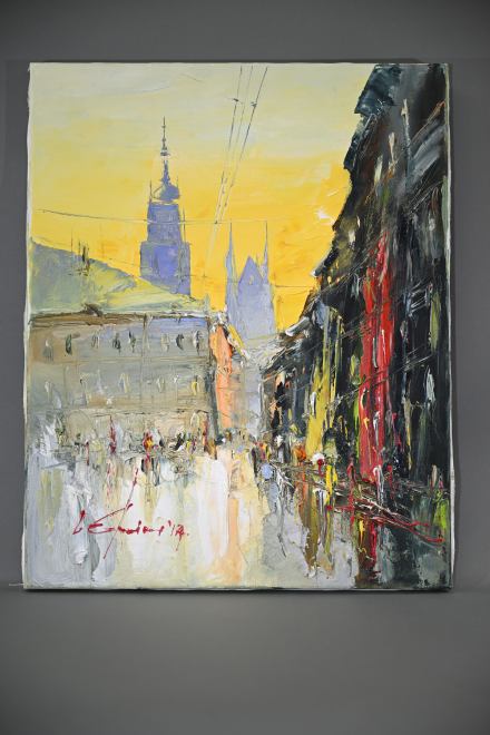 A painting by Ukrainian artist Ihor Yevsin, portraying the historic center of Lviv—its old architecture rendered in a vivid, colorful manner. Executed in acrylic on canvas, the work is original and signed by the artist.