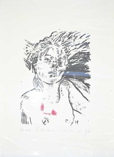 A screenprint by Ukrainian artist Serhiy Savchenko portraying a young girl gazing straight ahead, as if looking inward at the same time—dreamy, youthful, on the threshold of tomorrow.