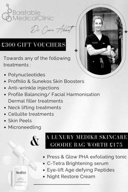 £300 of gift vouchers towards any treatment with Dr Ciara, at her award winning clinic, Barstable Medical Clinic.