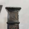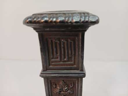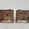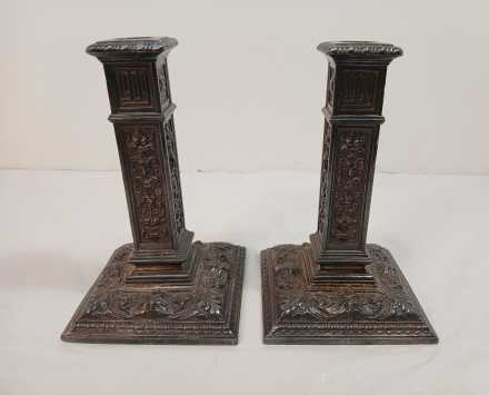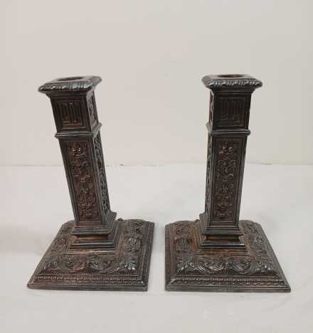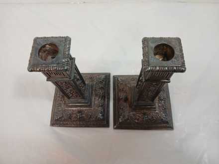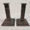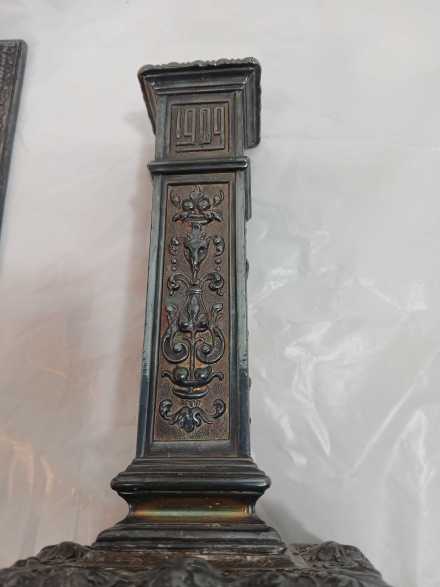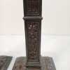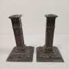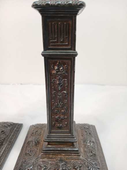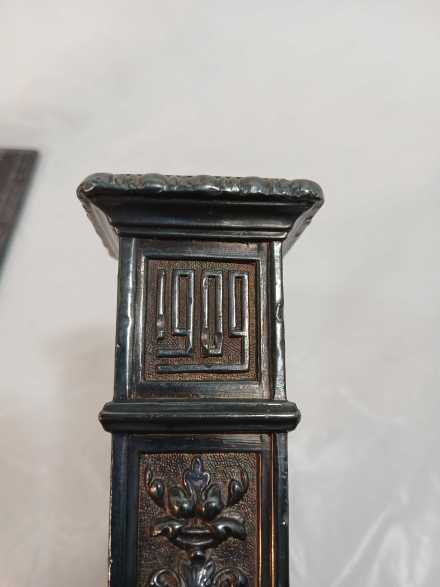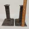 Pair of 7-1/4" tall metal candle sticks dated 1909. Base measures 4-1/2" x 4-1/2".