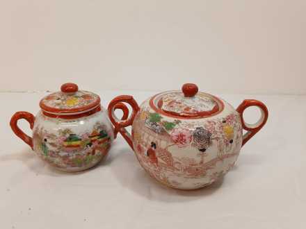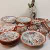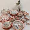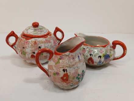 Assorted Made in Japan sandwich plates, berry bowls, cream pitchers, sugar bowls, cups, (2) 7-1/2" bowls. Asian figurine, unmarked.