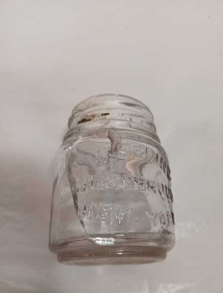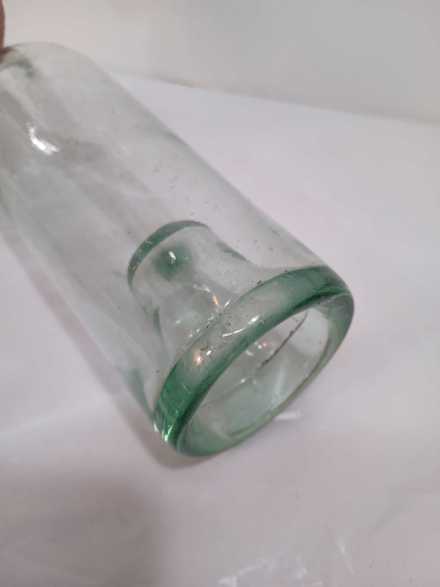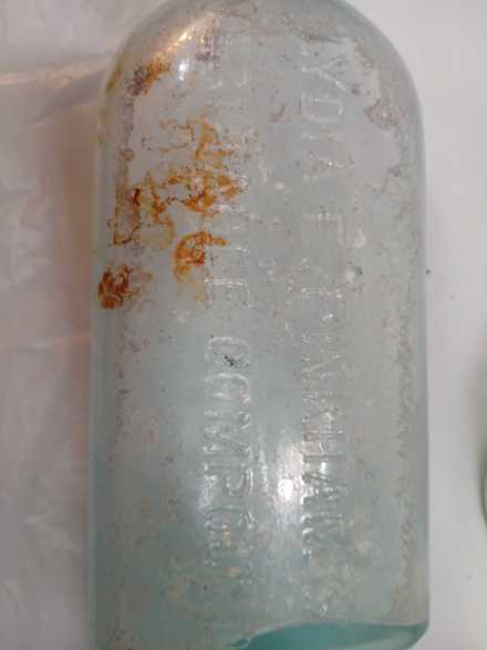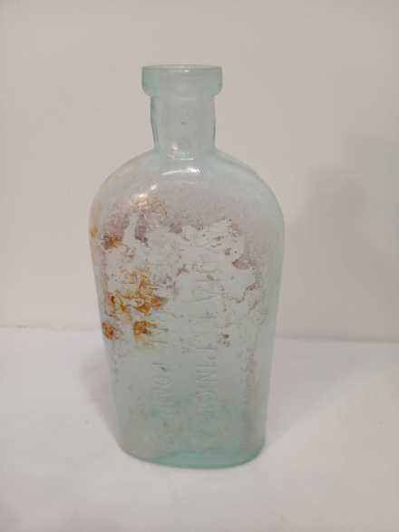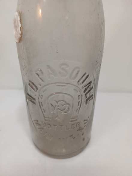 Assorted vintage bottles including Free Blown Point aqua green rum utility bottle, N.D. Pasquale, Main Ave, NJ, Vaseline (cracked), Rumford, and Lydia Pinkam's Vegetable Compound.