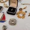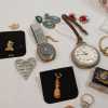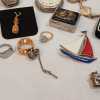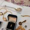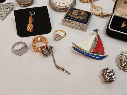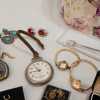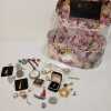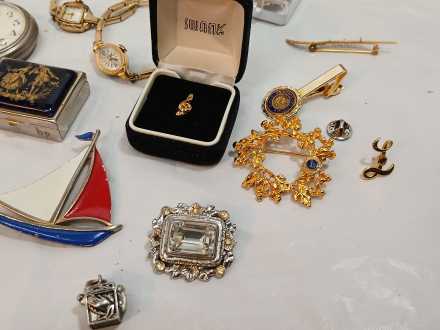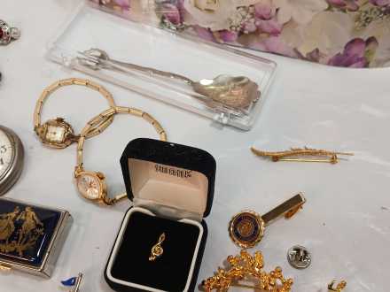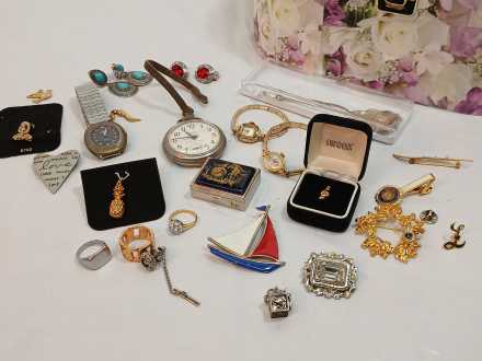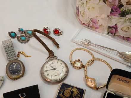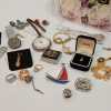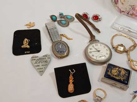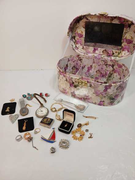 Assorted watches, unknown working condition. Assorted costume jewelry including Lions Club pins, pendants, earings, rings. pins, souvenir spoon, pill box and tie pins. Decorative cardboard carry case included.