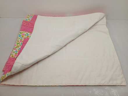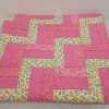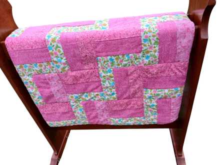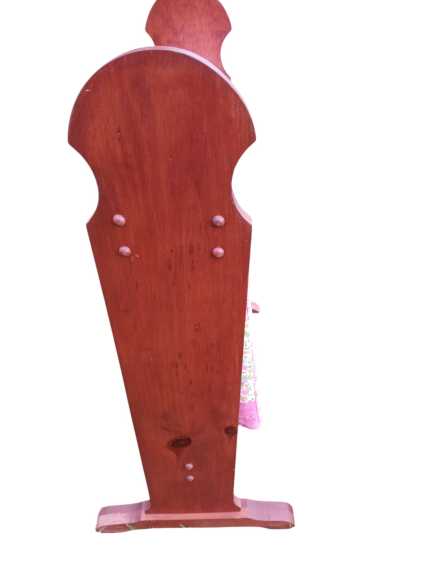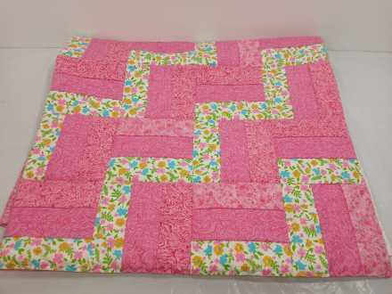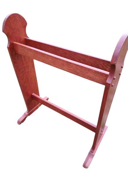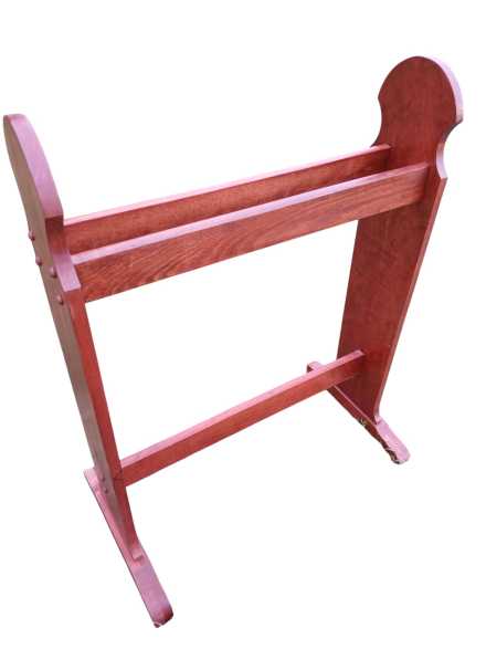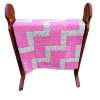 Wooden blanket rack, appears to be handmade. Small handmade quilt, 38" x 44". Quilt rack 25" long x 14" deep x 32" tall.