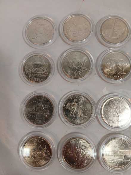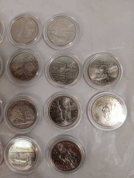 (18) uncirculated state quarters in plastic cases, dating from 1999 to 2003. (1) US Treasury commemorative coin.