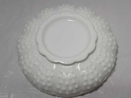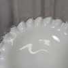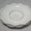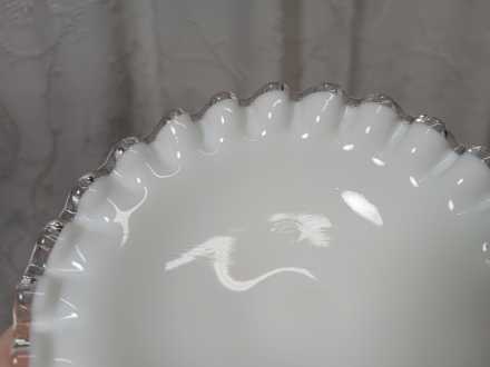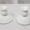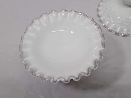 Vintage Fenton milk glass hobnail chip & dip footed bowl, marked. Pair of Fenton Silver Crest Spanish Lace candle holders, with label.