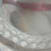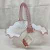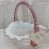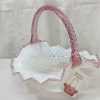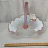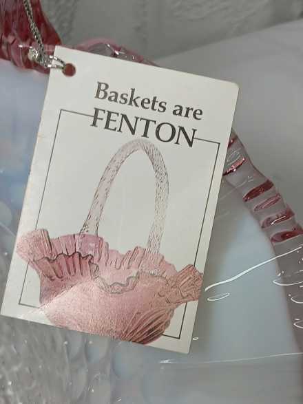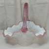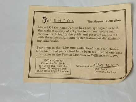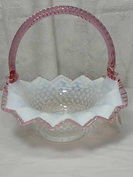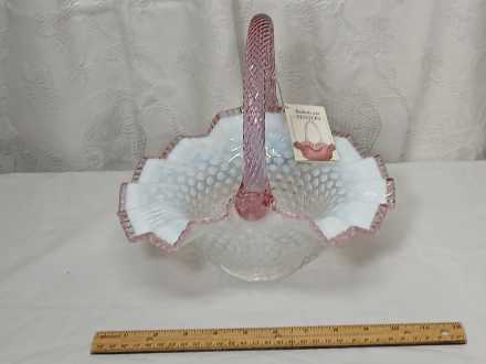 Fenton" Museum Collection" French Opalescent hobnail basket with dusty rose scalloped edge and twisted rib glass handle. Marked, with original tag and information card. Measures 10-1/2".