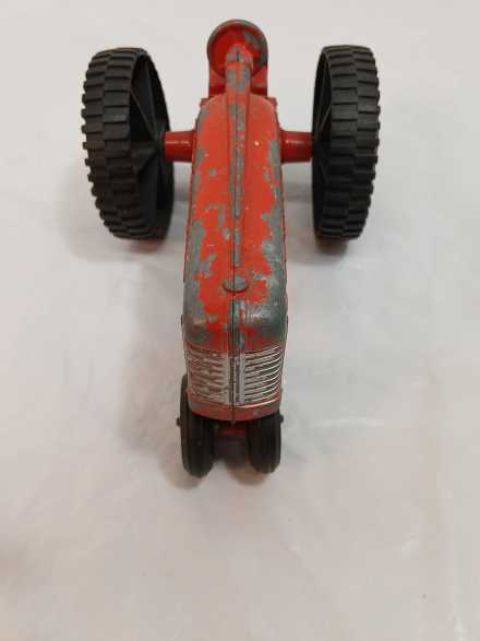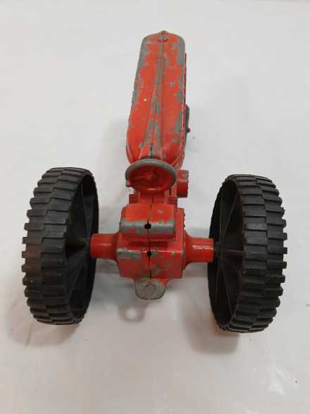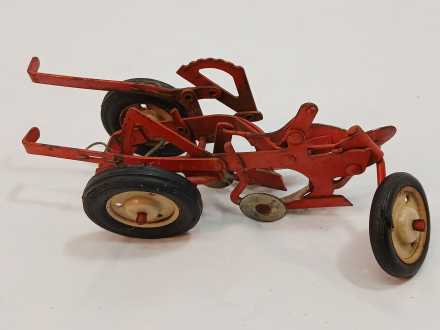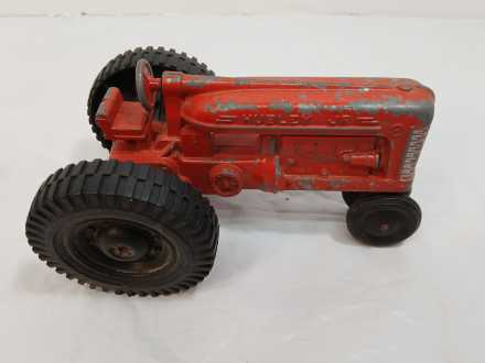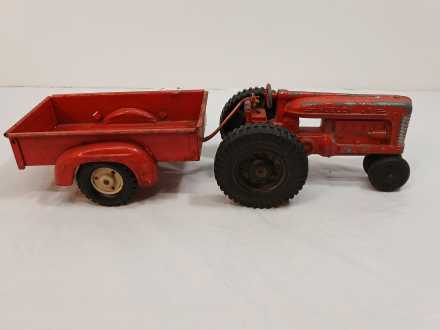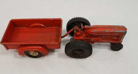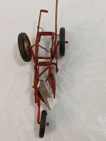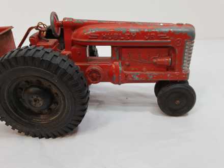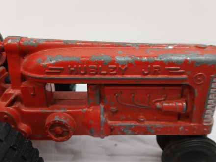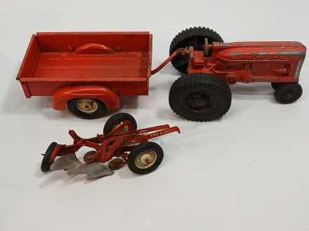 Hubley Jr tractor, some paint wear. With TruScale made in USA wagon/trailer and Plows. Please refer to pictures for condition of plows.