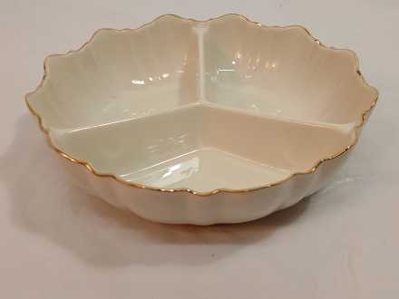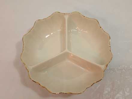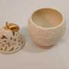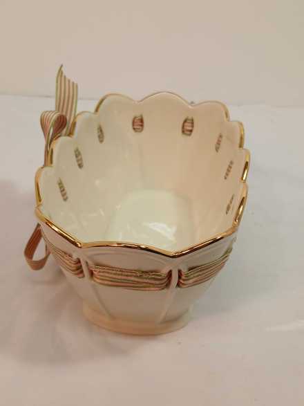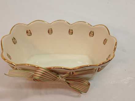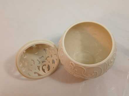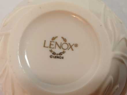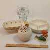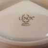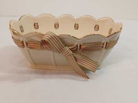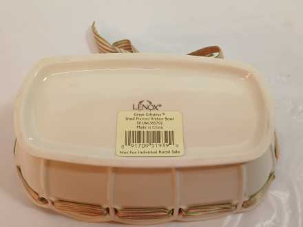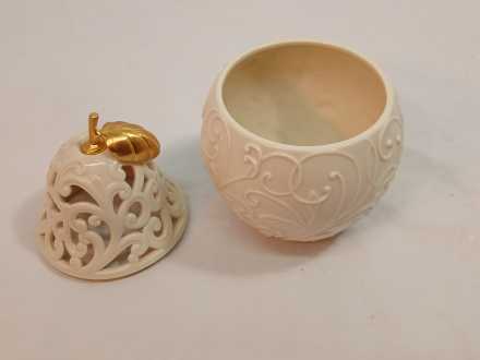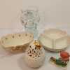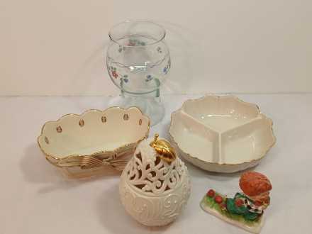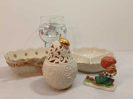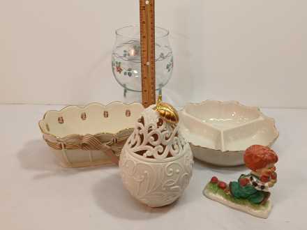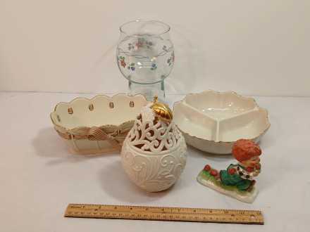 Lenox small pierced ribbon bowl. Lenox divided dish, made in USA. Lenox lidded pear. Goebel "Redheads" collection figurine "Forbidden Fruit". Pfaltzgraff candle holder.