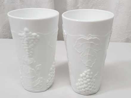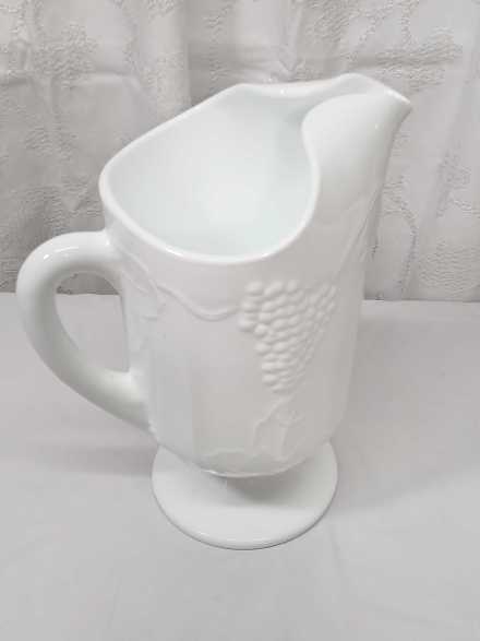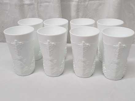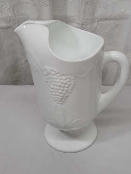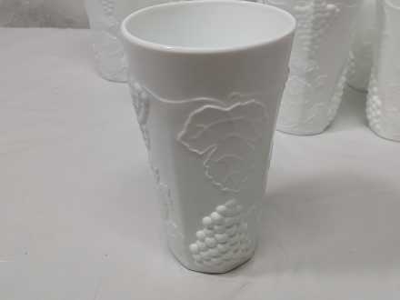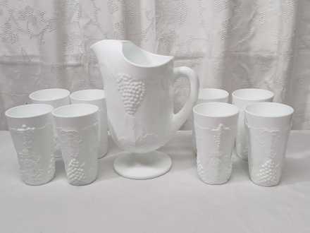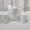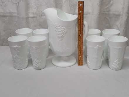 Milk glass 11" footed pitcher, unmarked. (8) milk glass 5-3/4" tumblers, unmarked