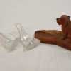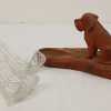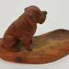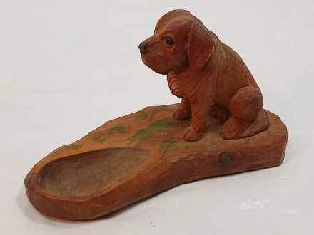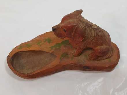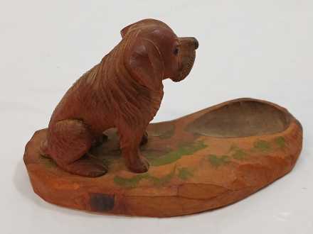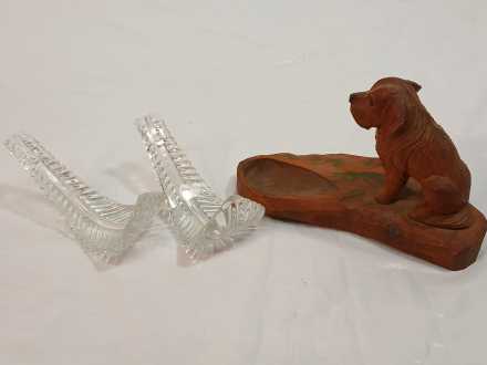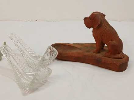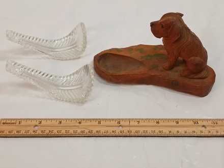 Pair of vintage glass leaf curtain tie backs with metal brackets, 4-1/2". Carved wood dog figure pipe holder, made in Italy. 7" long x 4-1/2" tall.
