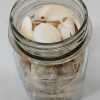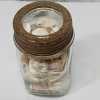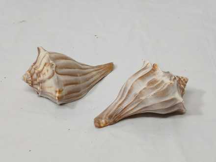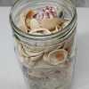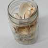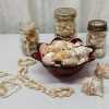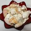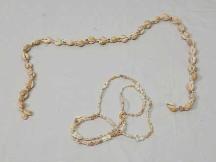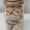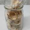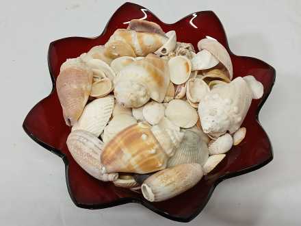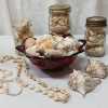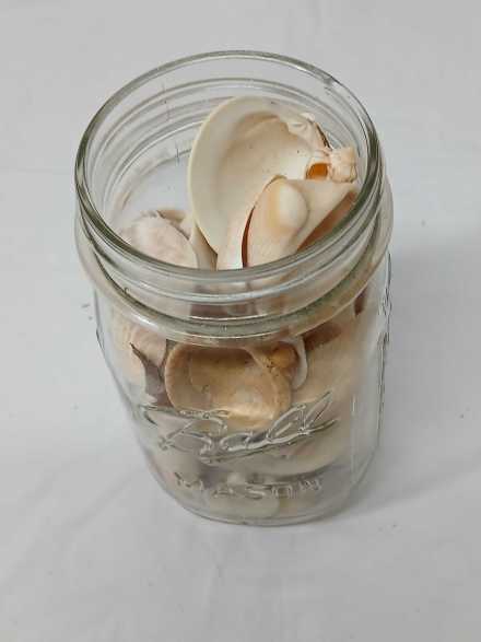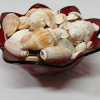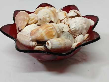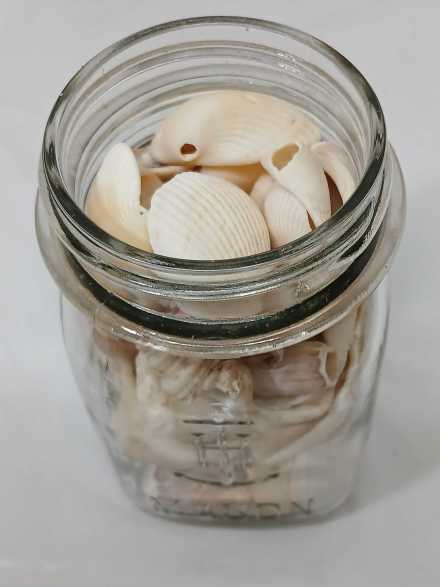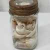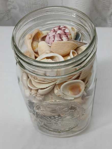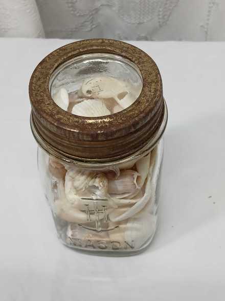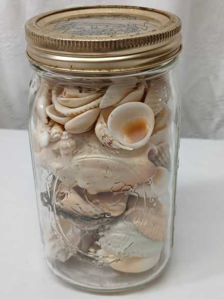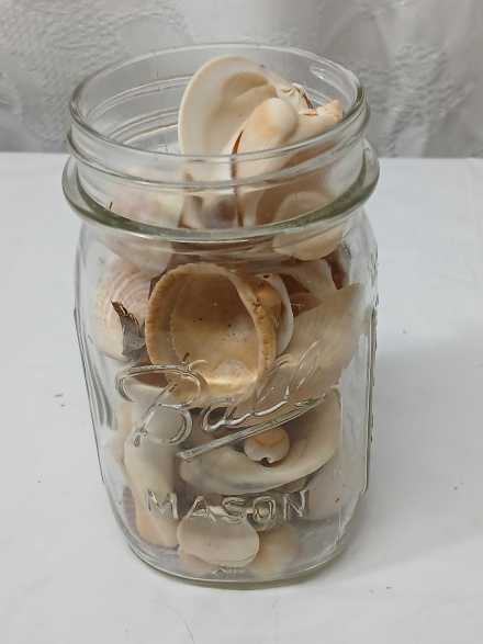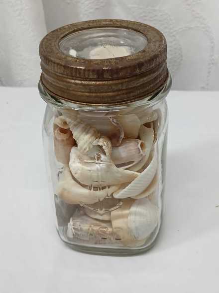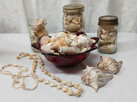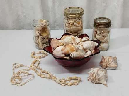 Seashell Assortment. Ball quart jar with small shells. Anchor Hocking pint jar with glass lid filled with small shells. Ball pint jar filled with small shells. Ruby glass bowl filled with shells, bowl is chipped. (2) Whelk shells. Strand of small shells, small shell necklace.