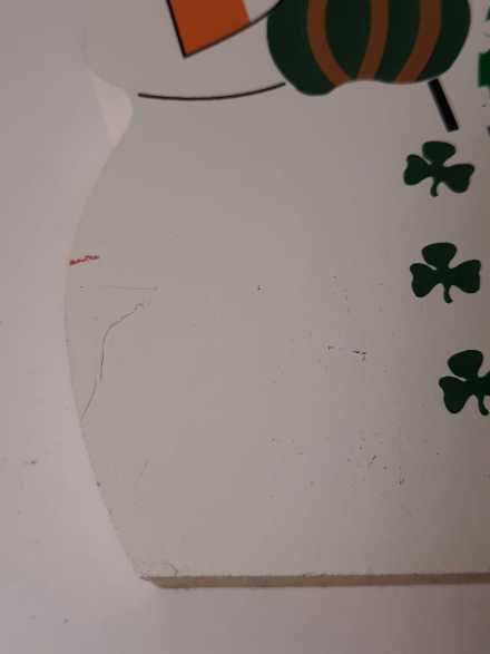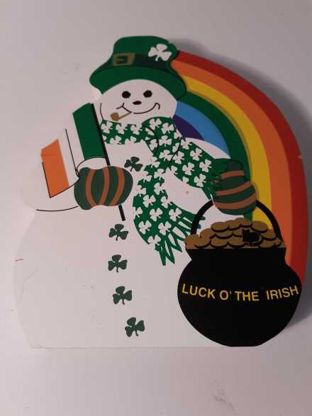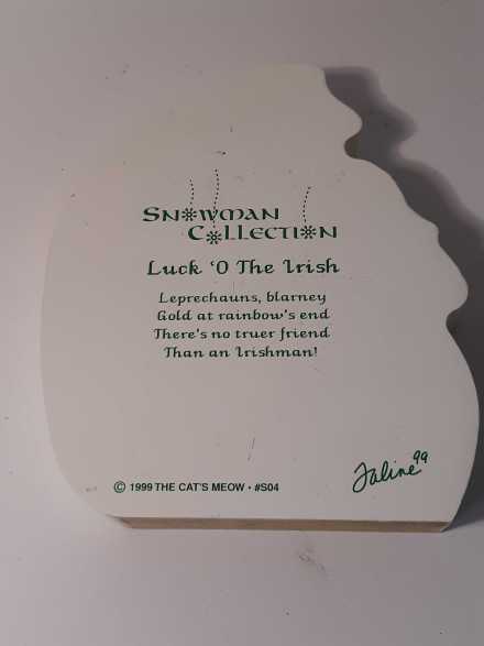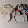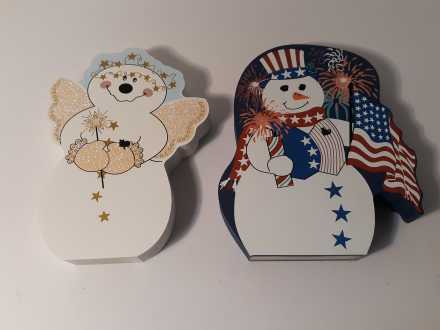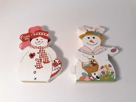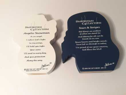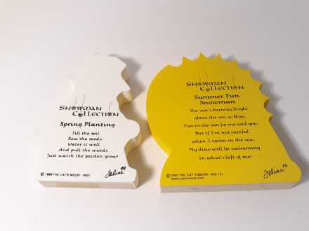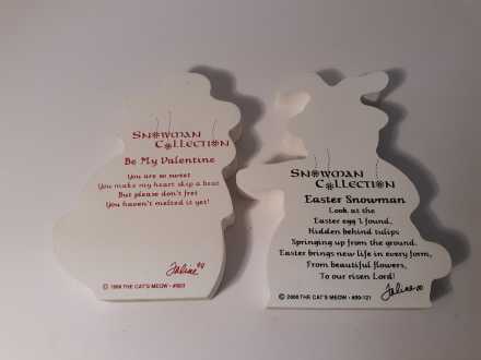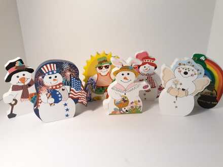 (7) Cat's Meow Snowman Collection wooden shelf sitters. 1999 "Be My Valentine" 1999 "Luck 'O the Irish" (has some marks, please refer to pictures) 2000 "Easter" 2000 "Stars & Stripes" 2002 "Angelic Snowman" 1999 "Spring Planting" 2002 "Summer Fun Snowman" All with original plastic sleeves