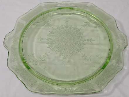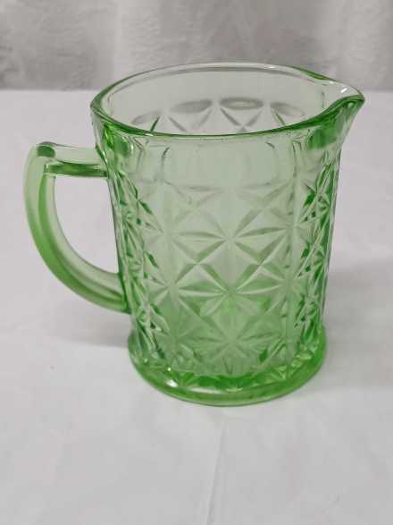 Vintage Anchor Hocking "Princess" pattern 10" footed cake dish, chip on the rim, chip on foot. Hazel Atlas 4" cream pitcher. Imperial Glass Diamond Quilted pattern 2-3/4" handled sugar bowl
