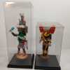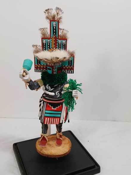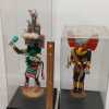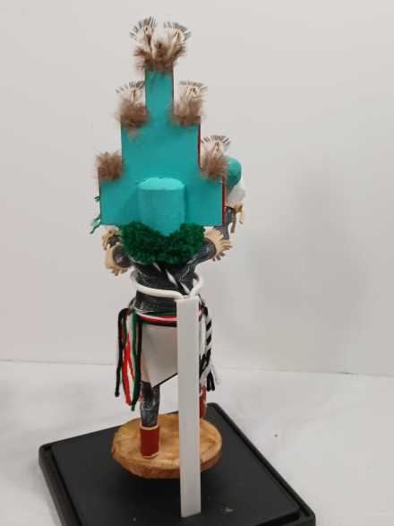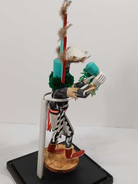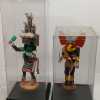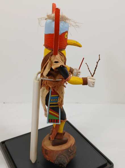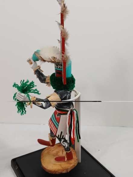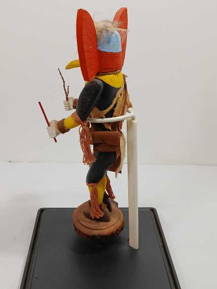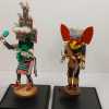 (2) wooden carved Native American Kachina dolls on metal stands, in plastic display boxes.