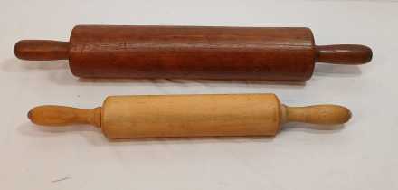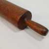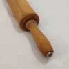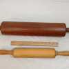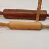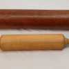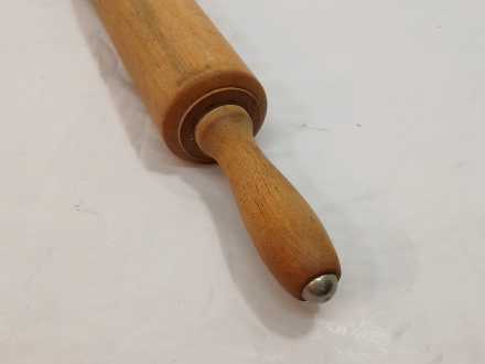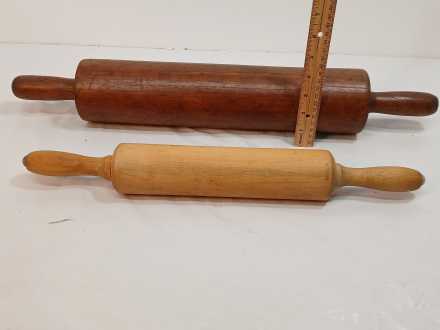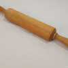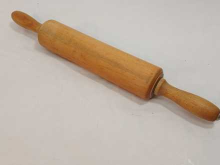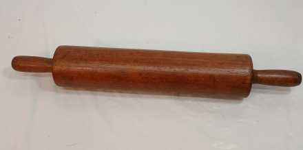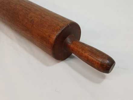 Massive bakers rolling pin, measuring 23-1/2" in length. Appears to be hand carved. Vintage wooden rolling pin with free moving handles, 18-1/2" long