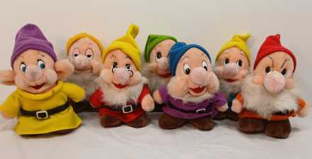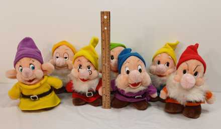 Vintage Disney set of all Seven Dwarfs plush dolls, with tags. approx. 7" tall.