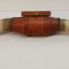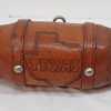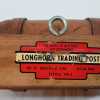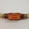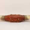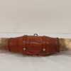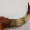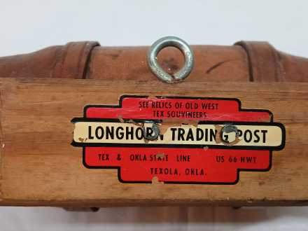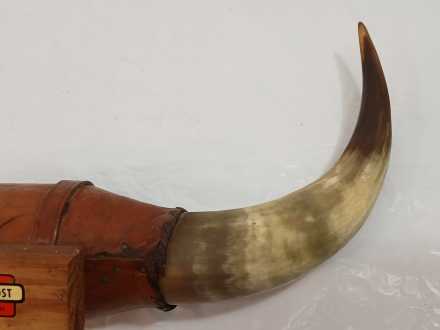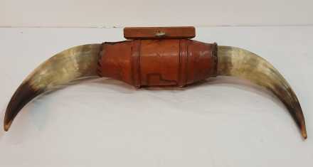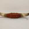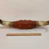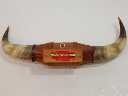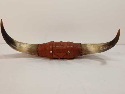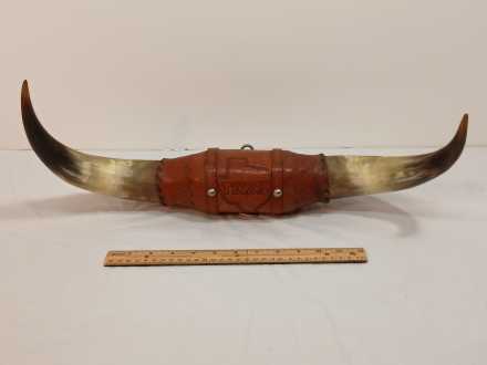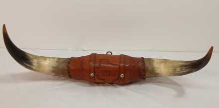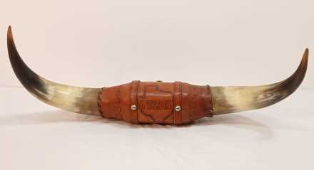 Steer horns with leather accent stamped "Texas". Mounted on wood block for wall display. Measures 20" long. Purchased at Longhorn Trading Post, at the Oklahoma and Texas border. Has some paint specks.