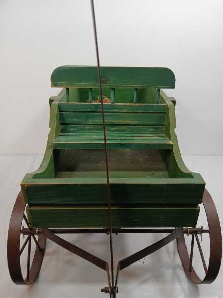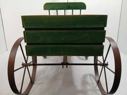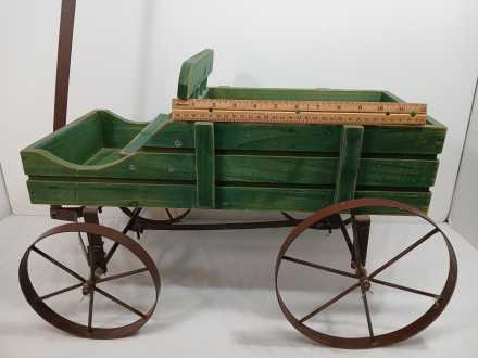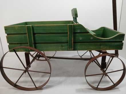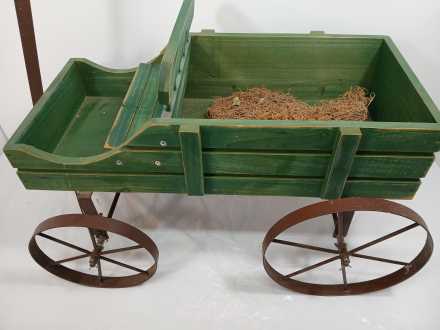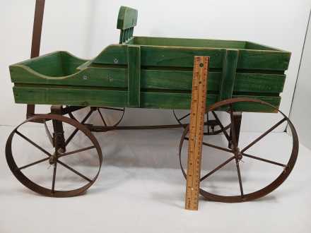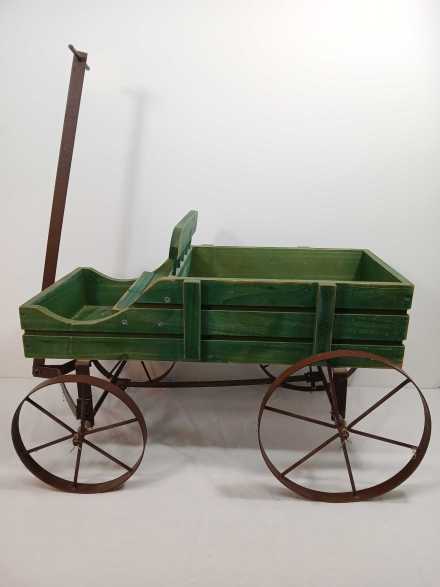 Wooden reproduction wagon with metal wheels, 22" long x 14" wide x 15-1/2" tall.