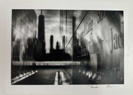 The engraved names in sharp relief draw the viewer into the moment, while the blurred cityscape beyond reminds us of both loss and hope. Rendered in striking black and white and printed on archival Epson photo paper, this image is as much a reflection on memory as it is a meditation on progress.