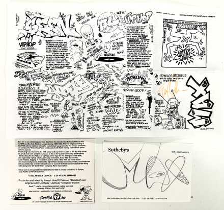 The collection includes a hand-signed copy of the fanzine by Eric Orr, filled with artwork by and in tribute to iconic figures such as SEEN and Keith Haring, alongside freestyle verses, sneaker sketches, and comic-style commentary. It captures the raw visual energy of 1980s NYC hip-hop culture.