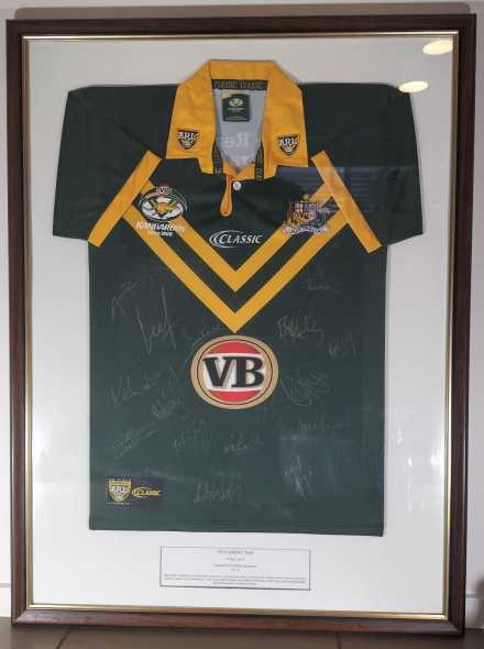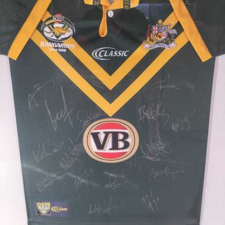 Authentic 2010 Kangaroos jersey, hand-signed and professionally framed. A standout piece of rugby league memorabilia featuring the iconic green and gold.