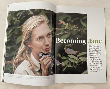 Englische Originalausgabe des National Geographic vom Oktober 2017 mit der Titelstory „The Making of an Icon. Becoming Jane“. Das Magazin widmet sich Dr. Jane Goodalls bahnbrechender Forschung in Gombe und ihrem weltweiten Engagement für Natur- und Artenschutz.