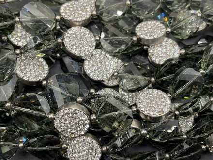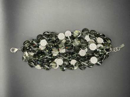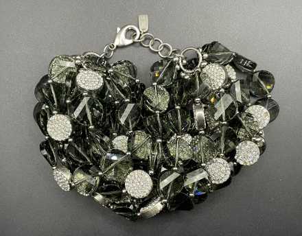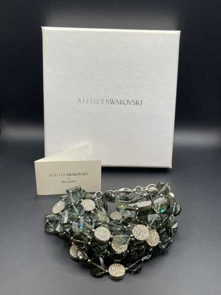 Dieses Armband aus der Atelier Swarovski Kollektion von Iris Apfel besteht aus mehreren Strängen mit funkelnden Kristallen in dunklen Tönen, kombiniert mit runden, glitzernden Elementen. Ein auffälliges Accessoire, das jedes Outfit aufwertet.