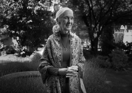 Diese schwarz-weiß Aufnahme von Dr. Jane Goodall, fotografiert vom international renommierten Fotografen und JGIA-Ehrenbotschafter Manfred Baumann, entstand im Jahr 2018 im Garten der Britischen Botschaft in Wien und ist von ihm persönlich signiert.