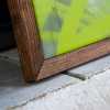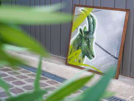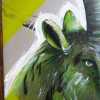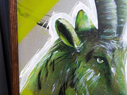 Das im Jahr 2024 mit Sprühdose & Acrylmarker entstandene Bild zeigt ein modernes, künstlerisches Gemälde eines Steinbocks, das in einem hölzernen Rahmen gefasst ist. Der Kopf des Tieres ist in grünlichen Farbtönen gehalten, wobei besonders die markanten, gebogenen Hörner ins Auge fallen. Die Konturen des Steinbocks sind mit weißer Farbe hervorgehoben, was ihm einen leuchtenden, fast grafischen Effekt verleiht. Der Hintergrund besteht aus abstrakten, gesprühten Farbflächen in Grau- und Grüntönen, mit dynamischen Linien und Farbverläufen, die dem Bild Bewegung und Tiefe verleihen.