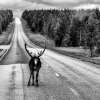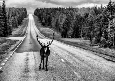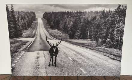 Dieses eindrucksvolle Werk des international renommierten Fotografen und JGIA-Ehrenbotschafters Manfred Baumann ist von ihm persönlich signiert und trägt den Titel „Walking Reindeer“ und entstand 2015 in Norwegen. Das Motiv zeigt ein einzelnes Rentier, das auf einer einsamen Landstraße durch die weite Landschaft wandert.