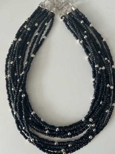 Handmade multi-strand necklace with matt black glass and silver ball beads from Naz Asgar