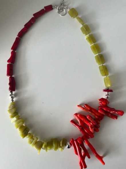 Handmade Necklace in red coral and green jade from Naz Asgar