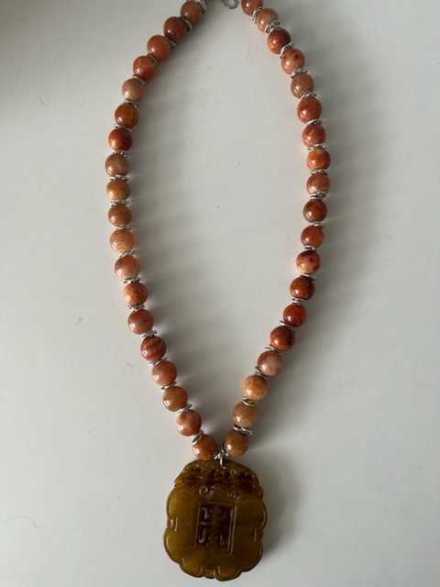 Handmade Necklace with brown jade beads and carved jade pendant from Naz Asgar