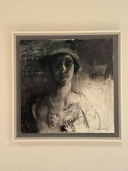 Margaret Woodward (b. 1938), painter, grew up in Sydney where she gained a scholarship to study art at the NAS. While still a student, she won the Le Gay Brereton Prize for Drawing; she has since participated in countless solo and group exhibitions. From 1961 to 1971 she taught at various secondary schools and colleges; from 1972 to 1978 she taught at the West Australian Institute of Technology in Perth; from 1979 to 1985 she taught at Hornsby College of TAFE. Meanwhile, from 1967 she travelled widely through remote areas of Australia and abroad. She won the Wynne Prize in 1971 and the Portia Geach Memorial Awards in both 1983 and 1984. Recipient of a number of smaller prizes, she has been an Archibald finalist seven times, several times with self-portraits, of which she has made many over the course of her career (the ‘horned’ turban is characteristic.)