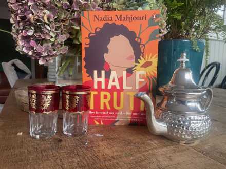 Signed copy of Nadia Mahjouri's novel Half Truth PLUS a small Moroccan tea pot with two tea glasses