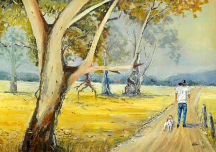 The piece: Set against a backdrop of golden paddocks and towering gums, a solitary figure and their dog take a quiet walk along a country road. The painting evokes the calm and nostalgia of rural life, with soft tones and gentle textures capturing a timeless moment in the bush.